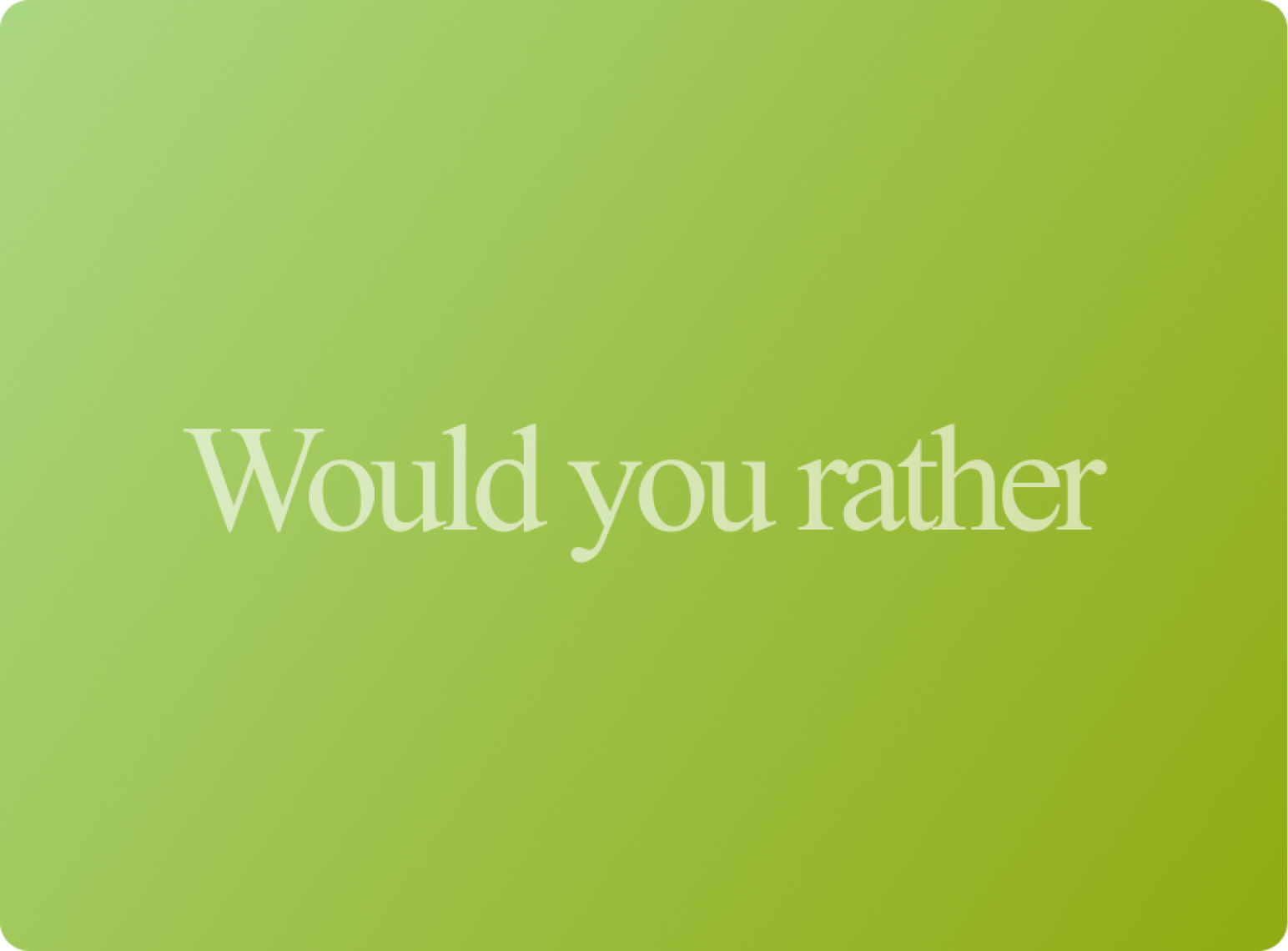 The game features thought-provoking questions, such as, “Would you rather eat and not gain weight, or always eat for free?”